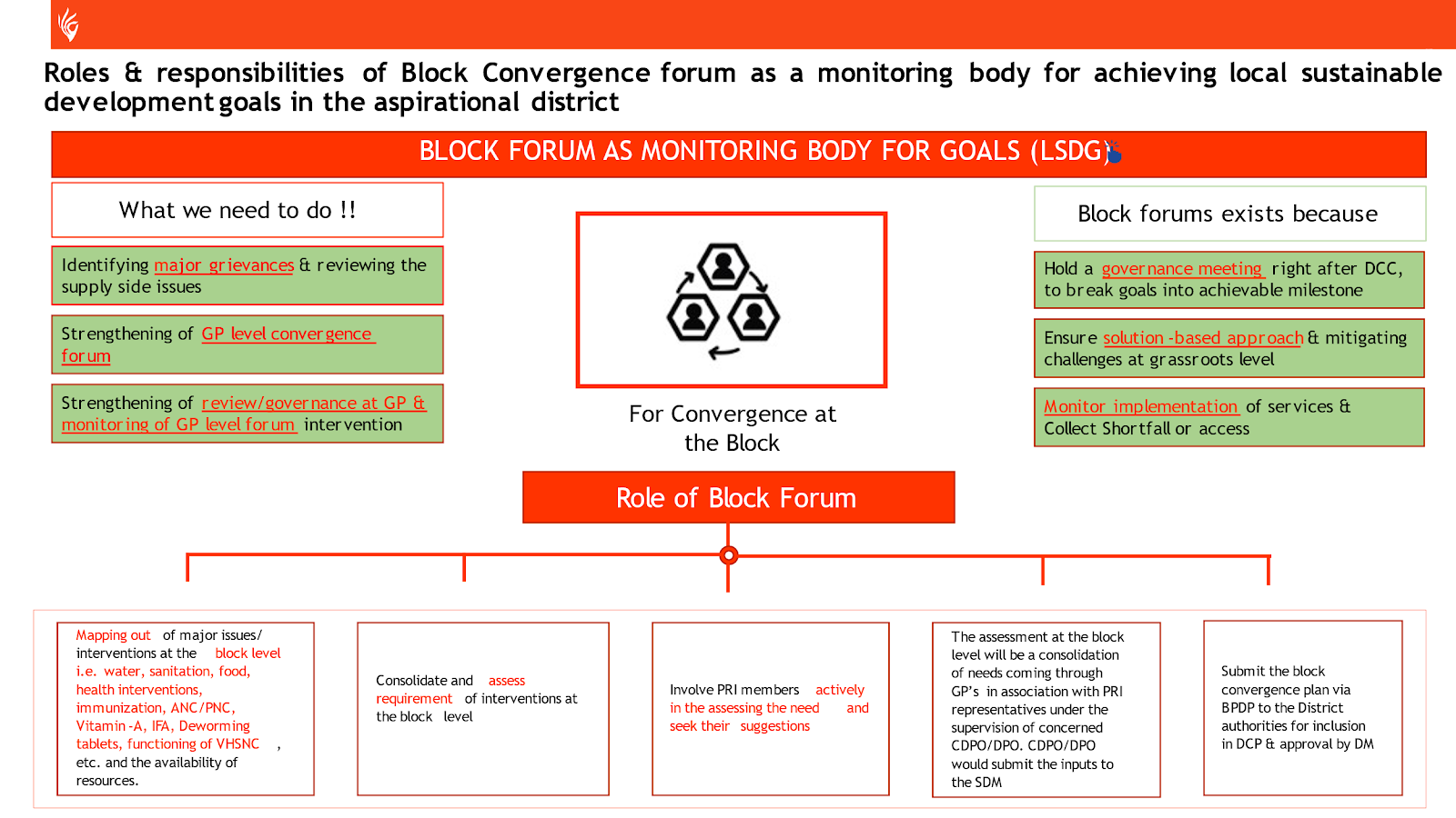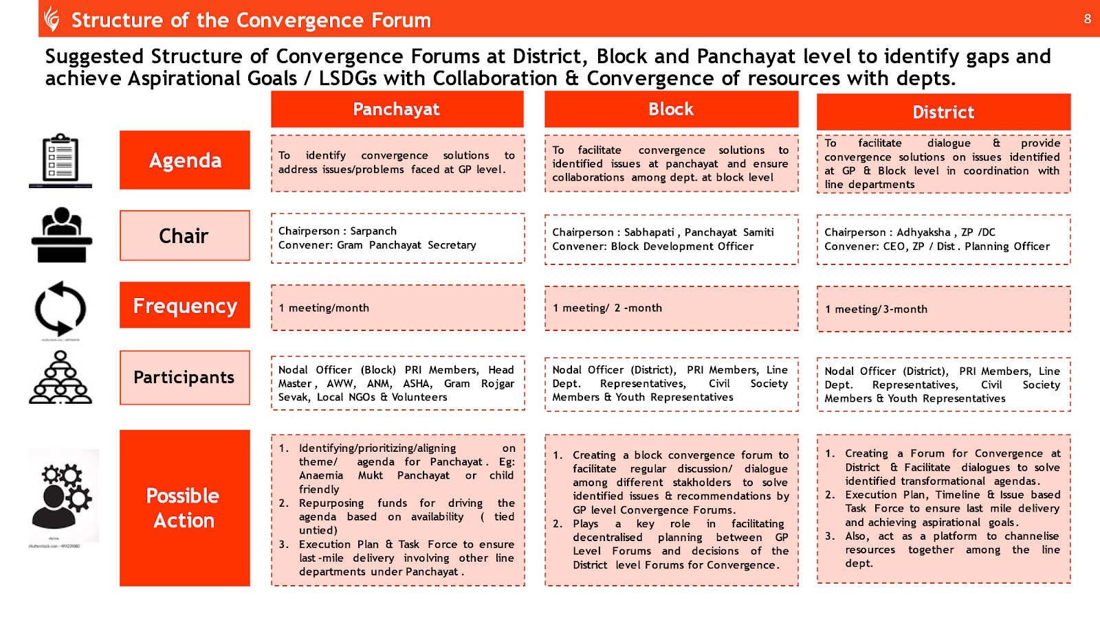 - Block Convergence Forum: Serving as a monitoring body, this forum will assess the activities of each Gram Panchayat, categorizing them as high cost, low cost, or no cost