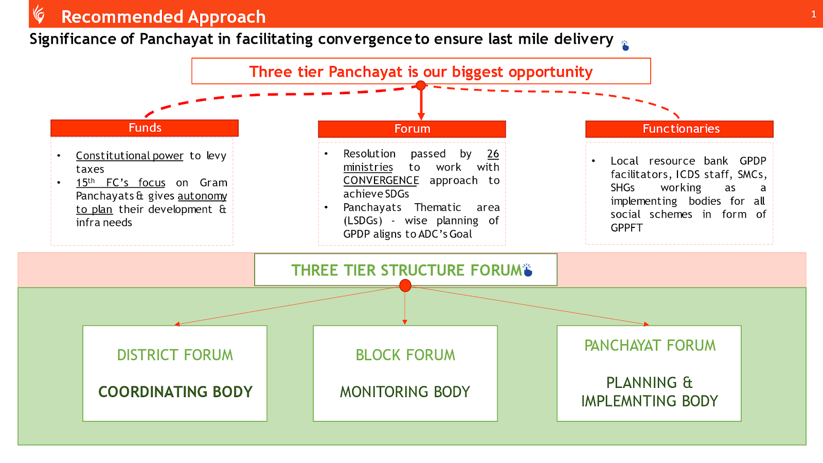 Presently, the Government of India, with a primary focus on Local Sustainable Development Goals (LSDGs), is channeling its efforts through the Ministry of Panchayati Raj. This involves the intervention of Gram Panchayat Development Plans (GPDPs) to align with the nine thematic areas of LSDGs. The imperative is clear: for India to achieve its Sustainable Development Goals (SDGs) by 2030, rural India must take the lead. Drawing from the insights gained through various pilot initiatives, our team has devised a three-tier strategy of forums: